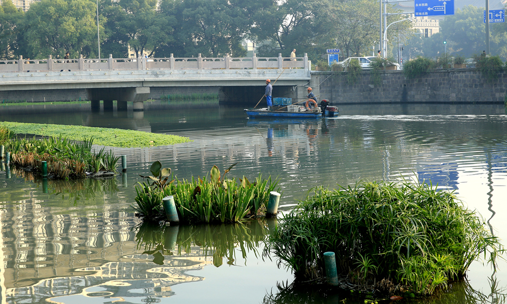 在一个有着轻微雾霾天气里看到北斗河上为清理河水而坚守岗位的劳动者