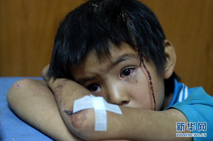 8月3日深夜,一名孩子在鲁甸县人民医院接受医治。 新华社记者胡超 摄