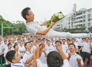 李兴贵中学团委书记董老师被学生高高抛起。记者刘波摄