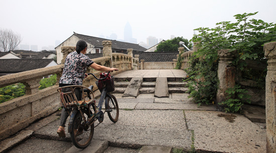 绍兴,一位市民推车经过八字桥。