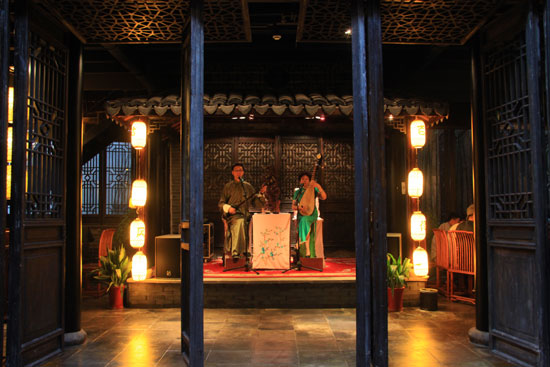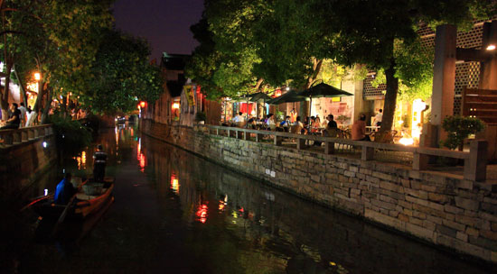 苏州,夜色下在平江路历史文化街区休闲的人们。