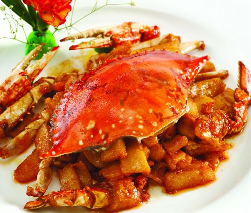 9、放入煎炸好的螃蟹块,翻炒烹入白酒。