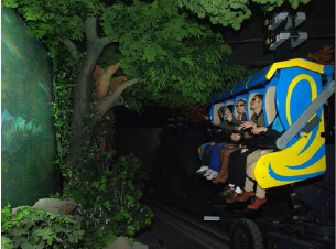 动感影院总投资约为4000万元,整个项目的建筑总长约119.7米,总宽约46.5米,最高处约5.5米,建筑总面积约3366平方米,项目的空间结构由排队区和车载轨道表演区两部分组成。共有5辆动感小车,15段影片,包括3块平面银幕和13个环幕,20个特技点。