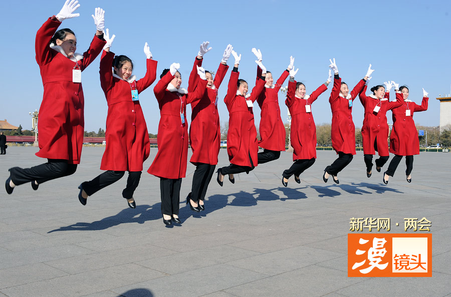 3月3日,中国人民政治协商会议第十二届全国委员会第三次会议在北京人民大会堂开幕。图为两会服务人员在广场上合影。新华网 翟子赫 摄