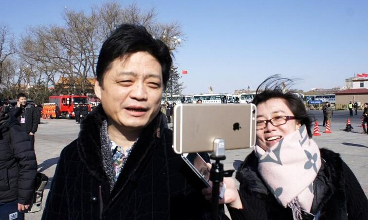 崔永元解释拿自拍架边走边拍时表示,“我想做个另类报道,通过我的视角观察两会。”图为2015年3月3日,北京,全国政协十二届三次会议在人民大会堂举行开幕会,崔永元拿着自拍架接受记者采访。
