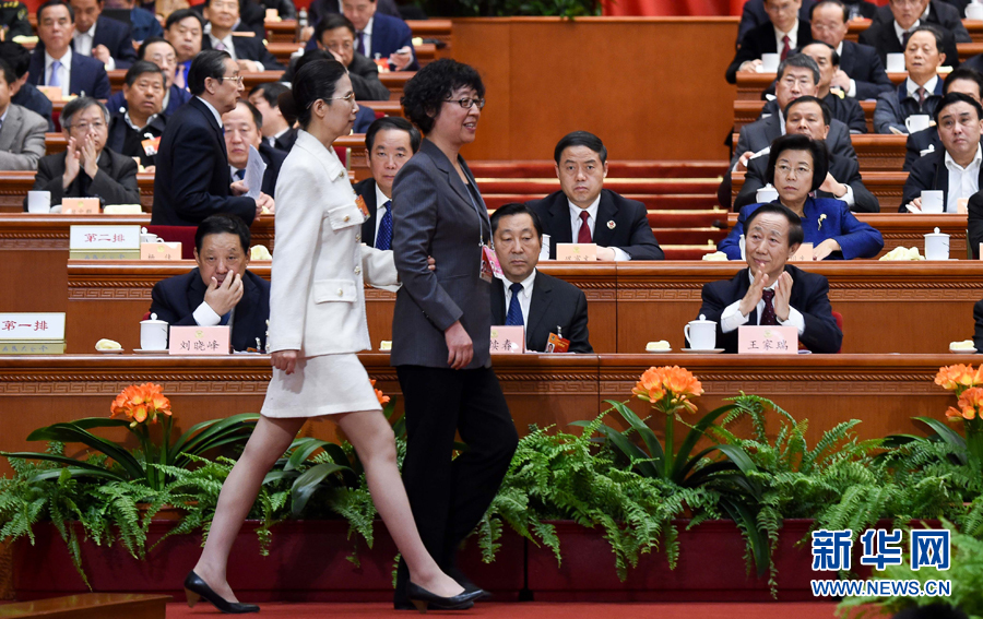 【正能量】3月11日,全国政协委员、盲人杨佳(前左)被引导着走向讲台。当日,杨佳代表九三学社中央在政协大会上作《点赞正能量 厚爱正能量 弘扬正能量》的发言。新华社记者王建华摄