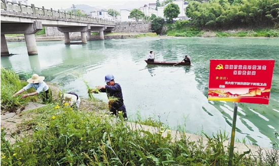 诸暨市枫桥镇对村中垃圾站、公厕、道路、绿化、河道等设立保洁责任岗,每位党员干部认领责任岗,负责责任区段长效保洁,并接受群众监督。连日来,枫源村党员在责任段江道清除杂草。 徐德文任光法摄