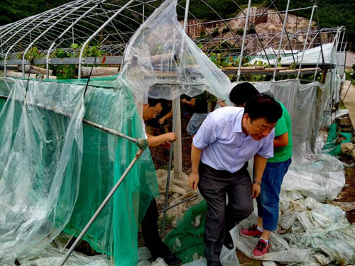 ![]() 刘奇在象山指导救灾。 ![]() 台风中受损的大棚。 今天下午,省委常委、市委书记刘奇驱车赶赴象山县指导救灾。 刘奇先后来到高塘岛乡龙珠村和晓塘乡西边塘村,察看水果基地受损情况。及膝的积水虽已退去,但不少精品水果基地受灾严重,一路过去,不时能看到工人们在争分夺秒维修损毁的大棚设施。 刘奇深入大棚察看葡萄、火龙果等水果受灾情况,向基地负责人了解情况。他说,眼看不少水果就要上市,却毁于台风,让人心痛。但是,人在信心在,我们要坚定信心,抓紧灾后恢复,携手共渡难关。