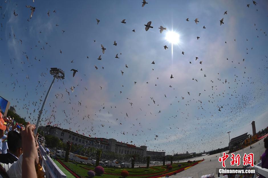 9月3日,纪念中国人民抗日战争暨世界反法西斯战争胜利70周年大会在北京隆重举行。图为放飞和平鸽。中新社记者金硕摄