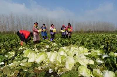 ↑2015年11月26日,在盱眙县淮河镇沿河村,泗洲蔬菜种植专业合作社的社员们在地里收获大白菜。新华社记者 季春鹏 摄