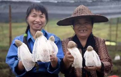 ↑2015年9月23日,在宜黄县棠阴镇河里村,菇农展示新采摘的竹荪。新华社记者 陈子夏 摄