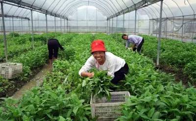 ↑2015年4月19日,菜农在江西省南丰县青源生态农业基地采摘空心菜。新华社记者 陈子夏 摄