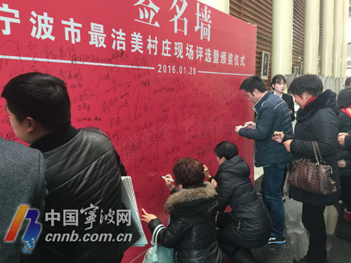 宁波市最洁美村庄村民代表在签名墙上签名