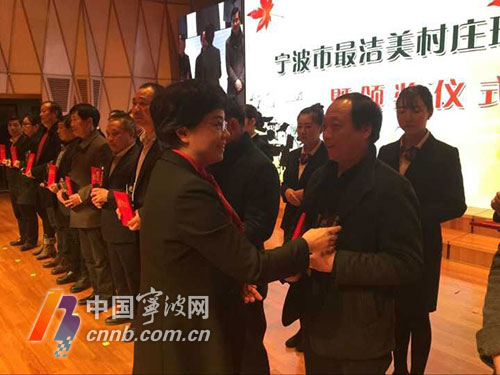余红艺为宁波市“最洁美村庄”获奖村庄代表颁奖(记者 吴冠夏 摄)