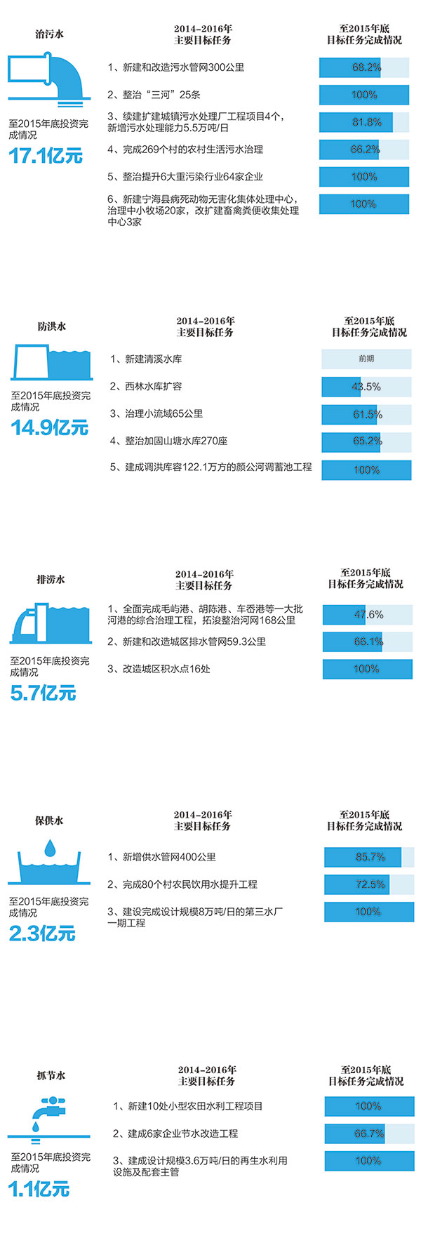 宁海始终坚持以项目为抓手,把治水工作与具体项目紧密结合起来。总体谋划建设的50个治水项目进展顺利,累计完成投资41.1亿元。在防洪排涝方面,按照“上拦、中疏、下排、外挡”的总体思路,全面推进水利工程建设,完成小流域治理40公里,整治加固山塘水库176座,调洪库容122.1万立方米的颜公河调蓄池工程已于去年5月下闸蓄水,并在“灿鸿”台风期间发挥“超级海绵”作用。在保供水方面,大力推进“开源提升”工程,清溪水库、西林水库、黄坛水库等工程建设顺利推进,完成农民饮用水提升工程58个,受益人口4万余人,新建改建供水管网342.8公里。在抓节水方面,重点推进工业、农业和生活节水,完成国华电厂4号机组凝汽器等4家工业企业节水改造工程,改造城市渗漏供水管网18.2公里,建成3.6万吨/日再生水利用设施及配套主管工程。