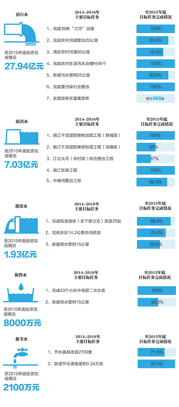 “五水共治”以来,江北区将治水强基作为一项重点工作,以重点水利工程为抓手,按照“外挡、中疏、强排”的治理思路,全面提升全区防洪排涝基础设施,两年来累计投入资金约7.03亿元。