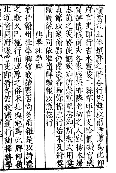 第一块牌谕是正德十三年四月颁发的《兴举社学牌》。牌谕云:“看得赣州社学乡馆,教读贤否,尚多淆杂;是以诗礼之教,久已施行;而淳厚之俗,未见兴起。”王阳明认为当时赣州的社学乡馆还不规范,没有为弘扬良好的社会风尚发挥应有的作用。他认为当务之急是提高教师的待遇,形成尊师重道的风尚,他要求地方官府“将各馆教读,通行访择;务学术明正,行止端方者,乃与兹选;官府仍籍记姓名,量行支给薪米,以资勤苦;优其礼待,以示崇劝。”这种以官府名义设于乡社间的学校,官府承担教舍建设、师资费用,并对入学生员给予免差役的待遇及一定的学资补助,一时在赣南极为昌盛。