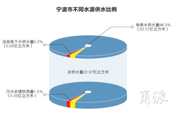 居民生活用水100%来自水库水。随着城乡供水一体化进程的加快,全市自来水总供水量达到9.87亿立方米,比2010年增加7.4%,其中宁波市区供水系统从2011年起结束河网取水,水源保障全部来自水库,领先全国同等城市水平。