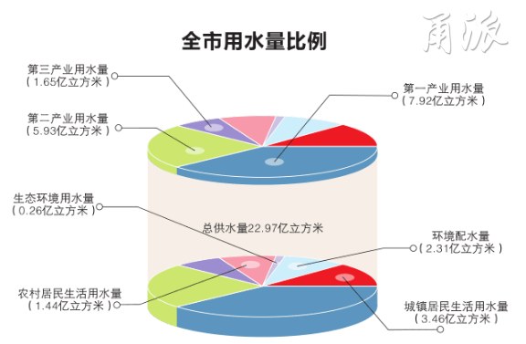 “十二五”期间,通过实施分质供水和联网联调供水,在保障经济社会发展用水需求的同时,我市用水结构进一步优化,用水效率进一步提升。公报显示,2015年全市用水总量22.97亿立方米,与2014年基本持平。2015年全市万元GDP(当年价)用水量为29立方米,比2010年下降31.0%,万元工业增加值(当年价)用水量为16.6立方米,比2010年下降10.8%,用水效率继续领跑全国和全省。