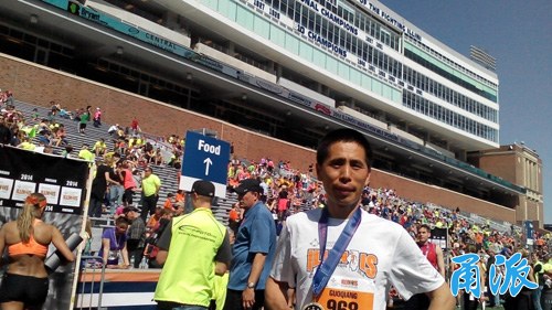陈国强说,虽然他连续跑11个上海全程马拉松的计划因为出国落空,但是他希望保持每年至少一个全马的参赛计划。在美一年,他跑了3个全马和1个半马。“印象最深的比赛是伊利诺伊马拉松赛,这是该州仅次于芝加哥马拉松赛的第二大马拉松,比赛在著名的伊利诺伊大学香槟分校所在地举行。该比赛每年4月举行,我是2014年4月参加的。4月在伊利诺伊比赛,气候很好,赛道地势平坦,我创造了个人第二好成绩,3小时12分00秒。这个成绩到达了男子41-45岁波士顿马拉松的报名标准。比赛终点是伊利诺伊大学的体育场,每个人的冲刺镜头在赛场大屏幕展现,播报员依次大声宣布,选手很有荣誉感。”