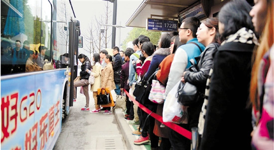 3月22日,杭州滨江区星光大道南口公交站,乘客们自觉排队上车。本报记者董旭明实习生冯贺摄
