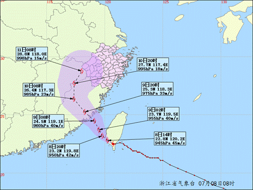 具体到我省,预计8日东海南部风力将逐渐增强至11到13级,8日和9日浙中南沿海海面风力有8到10级,阵风11到12级;9日温州、台州、丽水地区将有大雨暴雨,部分大暴雨;10到11日我省大部有大雨暴雨,局部有大暴雨。