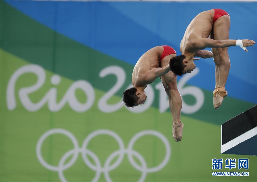 8月8日,林跃(左)/陈艾森在比赛中。当日,在2016年里约奥运会男子双人十米台决赛中,中国组合林跃/陈艾森以496.98分的总成绩夺冠。新华社记者费茂华摄