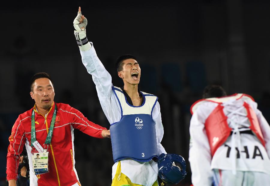 8月17日,赵帅(中)庆祝夺冠。当日,在2016年里约奥运会跆拳道男子58公斤级决赛中,中国选手赵帅战胜泰国选手汉普拉比,夺得冠军。新华社记者王毓国摄