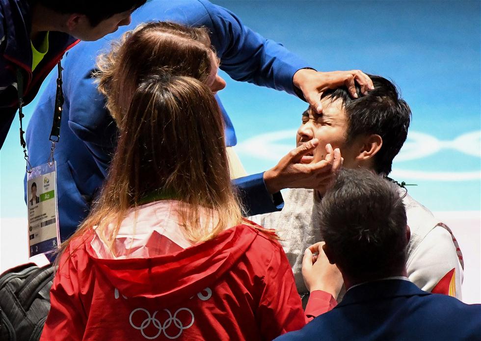 在奥运赛场上,无论赢得胜利,还是遗憾失利,中国健儿全心投入,无悔奉献,用精神和行动昭示着,拼搏精神永远都是中国竞技体育之魂。这是在2016年里约奥运会男子花剑团体赛中,中国队选手马剑飞(右)眼睛受伤(2016年8月12日摄)。新华社记者刘大伟摄