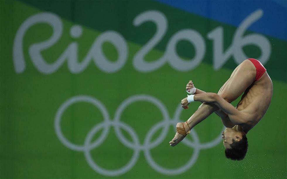 8月20日,陈艾森在比赛中。当日,在2016年里约奥运会跳水男子10米台决赛中,中国选手陈艾森以585.30分的总成绩夺得金牌。新华社记者王昊飞摄
