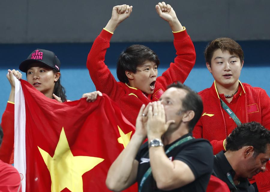 8月20日,中国跳水队为队友陈艾森的精彩表现喝彩。当日,在2016年里约奥运会跳水男子10米台决赛中,中国选手陈艾森以585.30分的总成绩夺得金牌。新华社记者丁旭摄