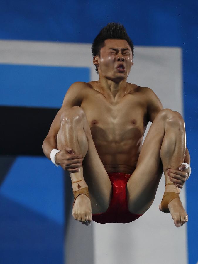 8月20日,陈艾森在比赛中。当日,在2016年里约奥运会跳水男子10米台决赛中,中国选手陈艾森以585.30分的总成绩夺得金牌。新华社记者丁旭摄