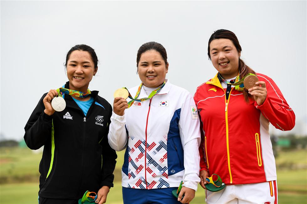 8月20日,冯珊珊(右)与朴仁妃(中)、高宝璟在颁奖仪式上合影当日,2016年里约奥运会女子高尔夫比赛落幕,中国选手冯珊珊获得铜牌,韩国选手朴仁妃和新西兰选手高宝璟分获冠军和亚军。新华社记者刘大伟摄