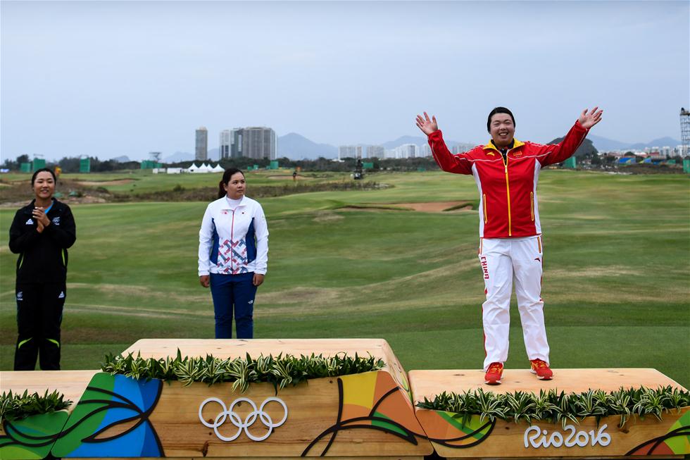 8月20日,冯珊珊(右)在颁奖仪式上庆祝。当日,2016年里约奥运会女子高尔夫球比赛落幕,中国选手冯珊珊获得铜牌。新华社记者刘大伟摄