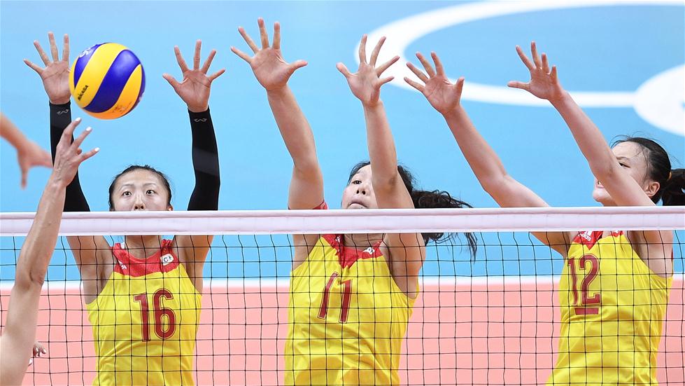 8月20日,中国队球员丁霞(左)、徐云丽(中)与惠若琪在比赛中拦网。当日,在2016年里约奥运会女子排球决赛中,中国队对阵塞尔维亚队。新华社记者王鹏摄