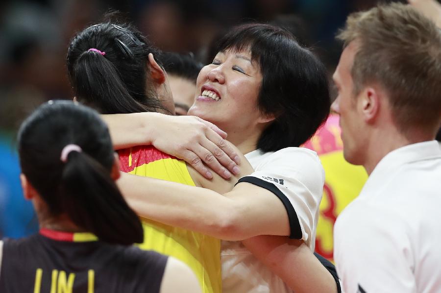 8月20日,中国队主教练郎平与球员拥抱庆祝。当日,在2016年里约奥运会女子排球决赛中,中国队以3比1战胜塞尔维亚队,夺得冠军。新华社记者任正来摄