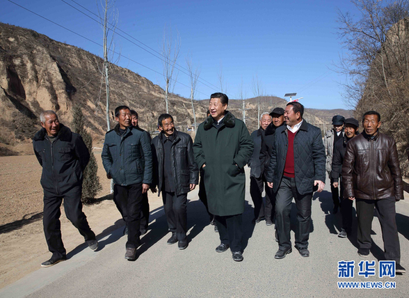 2015年2月13日上午,习近平在陕西省延安市延川县文安驿镇梁家河村看望村民,并就革命老区脱贫致富进行实地调研。新华社记者兰红光摄