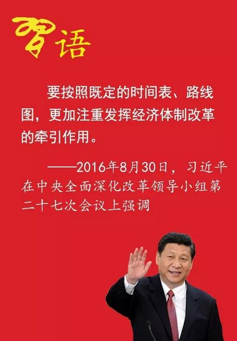 2016年8月30日,在中央全面深化改革领导小组第二十七次会议上,习近平强调,要按照既定的时间表、路线图,更加注重发挥经济体制改革的牵引作用。