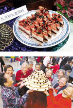 据史料记载,重阳糕又称花糕、菊糕、五色糕,制无定法,较为随意。九月九日天明时,以片糕搭儿女头额,口中念念有词,祝愿子女百事俱高,乃古人九月作糕的本意。讲究的重阳糕要作成九层,像座宝塔,上面还作成两只小羊,以符合重阳(羊)之义。