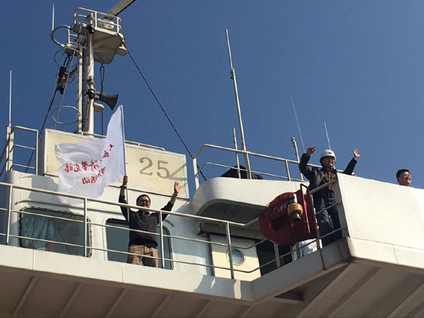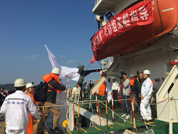第一支采访组的成员们登上集装箱班轮,开往乍浦港。