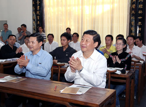 2009年4月1日,习近平在河南调研时,兴致勃勃地来到学生自发组织的以“知行合一、报效祖国”为主题的理论研讨会会场,与大学生们进行交流和探讨。