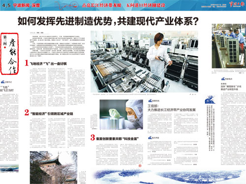 采访中,各地不约而同地提出,希望宁波在长江经济带产业协作分工中能扮演“硬角色”,加大与兄弟省市的优势互补,加强产业中高端合作,打造跨区域的中高端产业链,实现错位竞争、合作共赢。