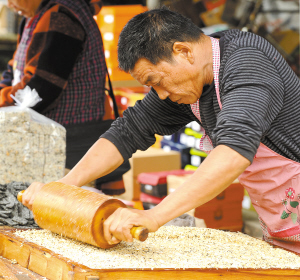从临海赶来的赵志敏跟着集市跑了16年,他现场制作的台州米干糖永远是集市的热销品。