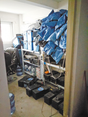 记者走进了楼道,远远就听到了类似电流的声音。循声走过去,一间储藏室门开着,一名男子坐在电脑前,忙碌地接着电话。在他身后,约10平方米的空间里,铁架和地上,密密麻麻地摆放着近二十个电瓶。铁架上有个电插板,门口也有一个,七八个电瓶和门外走廊里的一辆电动车正充着电。