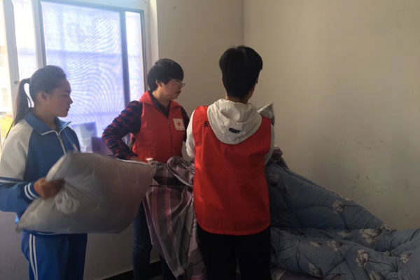 在孩子们的带领下,我们来到他们的寝室。女生寝室一层有8间,在寝室的另一边有洗漱室,还配有一个小型的洗衣机。寝室由四个床位,两个大孩子带两个小孩子。据老师介绍,这些孩子生活上都基本能够自理。我们将送来的新的被子,被套、枕头等床上用品仔细地给孩子们套上。