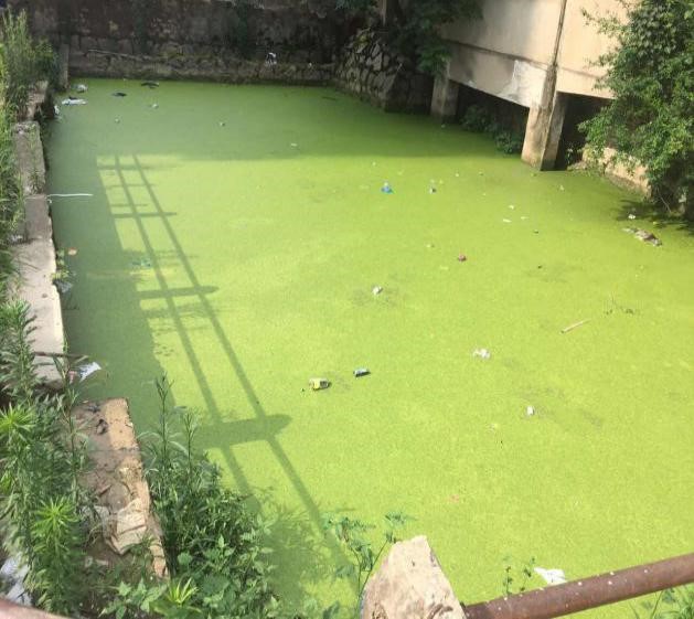 宁海县兴宁南路街西侧的泊水塘水体浑浊、散发臭味,水面有浮萍和垃圾。
