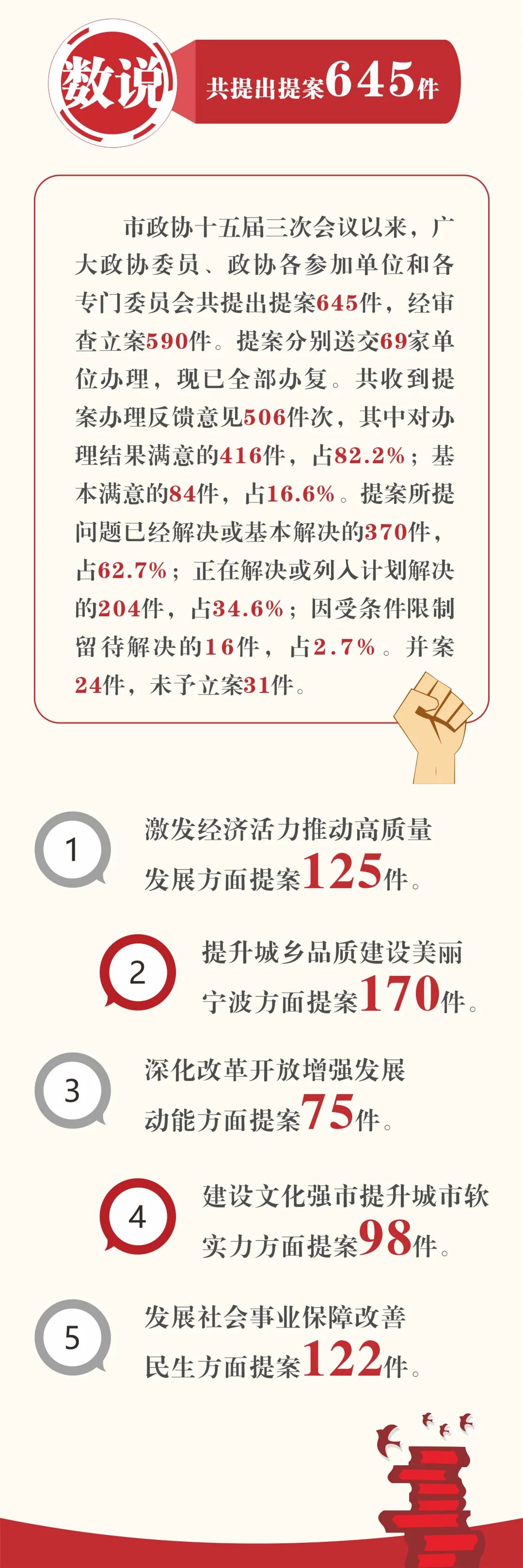4月26日上午9时,政协第十五届宁波市委员会第四次会议正式开幕。杨戌标代表政协第十五届宁波市委员会常务委员会作工作报告。受政协第十五届宁波市委员会常务委员会的委托,陈为能向大会作提案工作情况报告。小编带你一图读懂↓