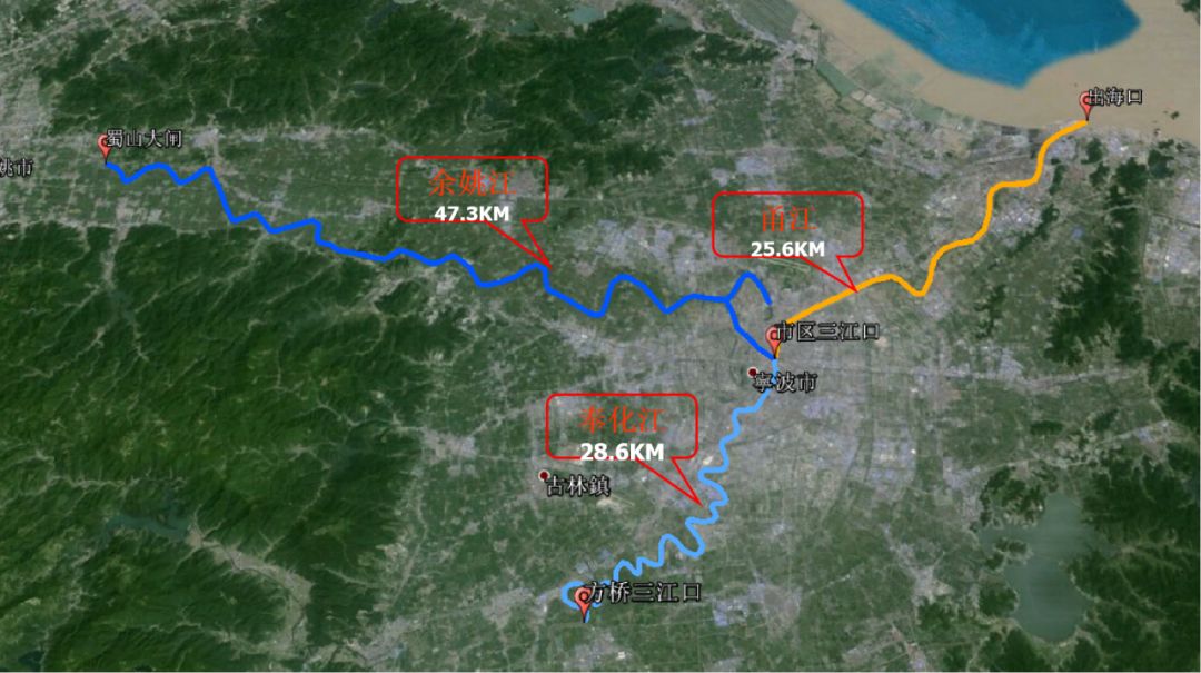 姚江,古称舜江,发源于余姚市大岚镇夏家岭,干流全长107.4公里,流域面积1934.1平方公里。其中下姚江从蜀山大闸至市区三江口河段,长约47.3公里,流经余姚、海曙、江北等3个区(市),与奉化江汇流后由甬江东流入海,是世界文化遗产浙东运河的重要组成部分。