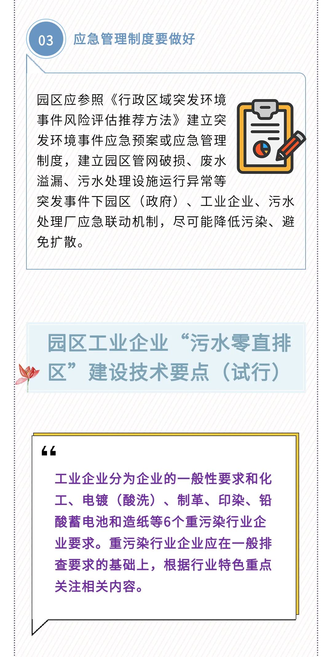 为全面提升工业园区(工业集聚区)“污水零直排区”建设规范化、标准化水平,特制定《工业园区“污水零直排区”建设技术要点(试行)》(以下简称《园区技术要点》)和《园区工业企业“污水零直排区”建设技术要点(试行)》(以下简称《企业技术要点》),为工业园区和园区内企业推进“污水零直排”建设提供详细指导。