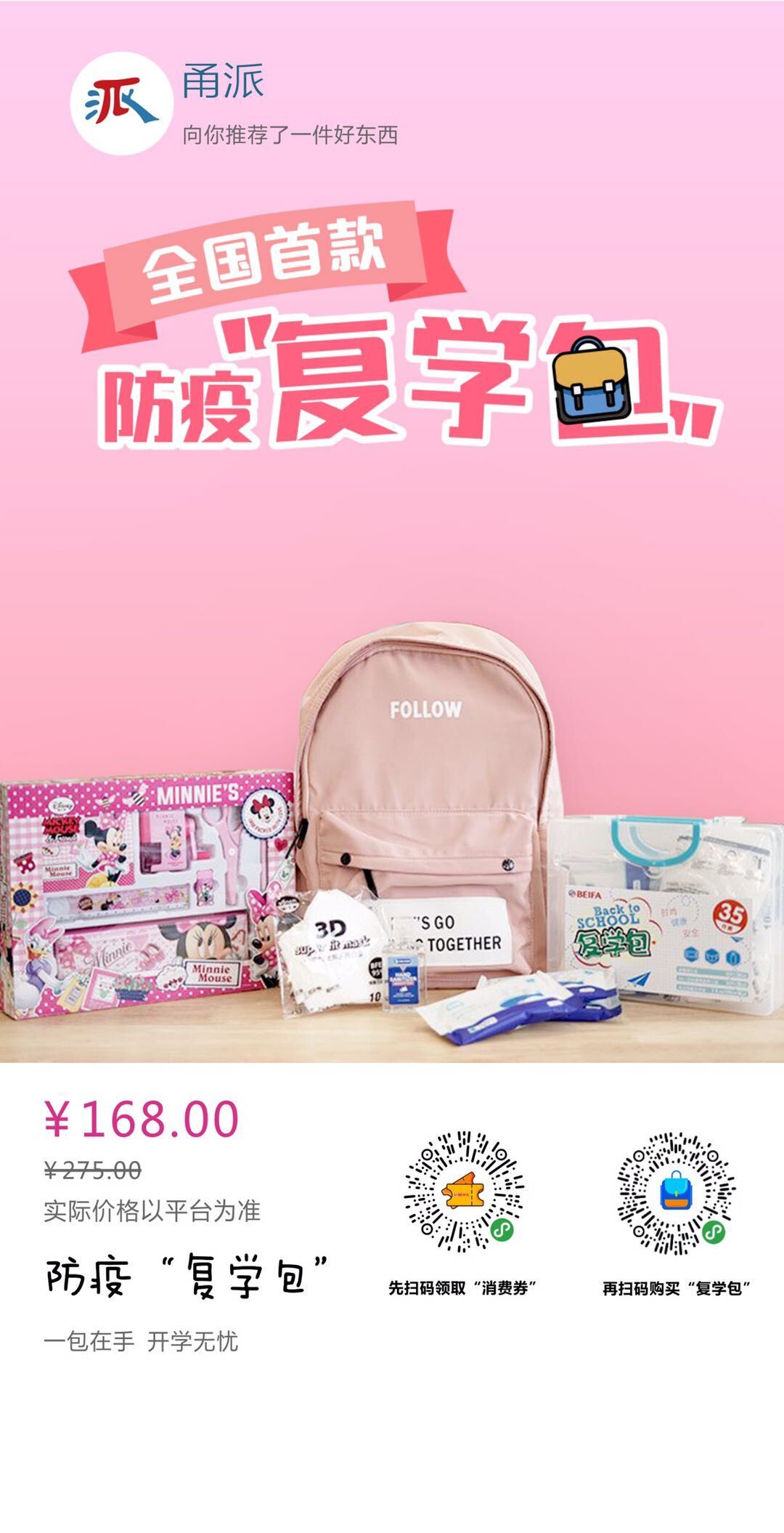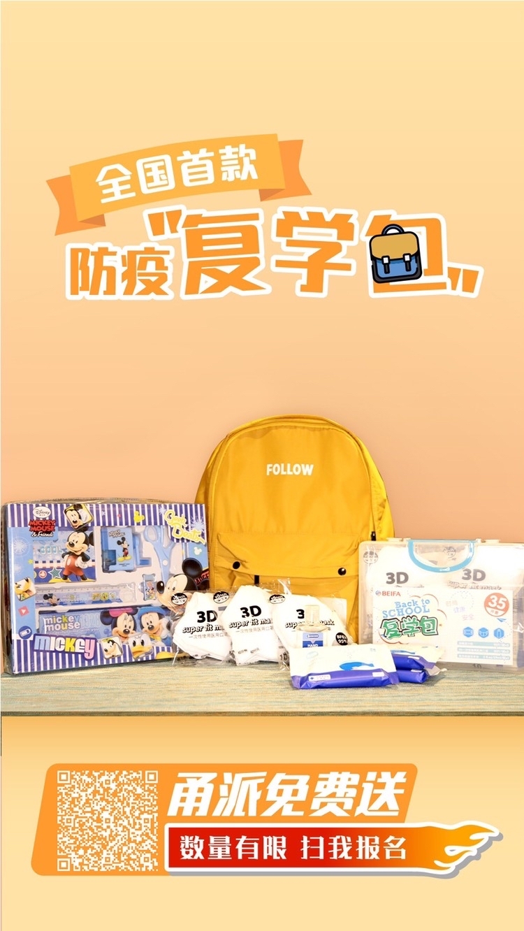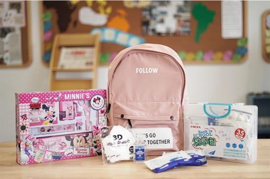 这个全国首款防疫“复学包”由贝发集团赞助,价值275元,内有3D一次性使用医用口罩30片 、消毒湿纸巾30片 、 59ml外贸款免洗抑菌洗手液1瓶、迪士尼文具礼盒套装1个(含铅笔、卷笔刀、小手帐、尺子、文具盒等)、学生书包1个。